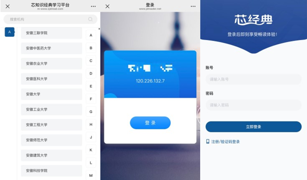 第二步:选择/检索【汉江师范学院】-连接【校园网WiFi】-输入【手机号+验证码】完成账号注册,注册完后开启阅读学习之旅。
