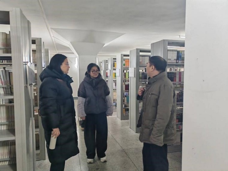 朱圣平一行深入书库、自习室等区域排查安全隐患,重点检查了馆舍门窗、馆藏文献存放的防潮措施、书架的稳固性及电路设备运行等情况,听取了丹江口校区图书馆管理部杨晓月同志关于近期工作落实情况和寒假轮休期间工作安排的汇报。